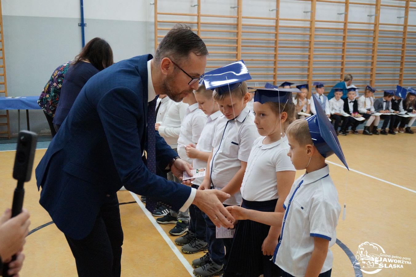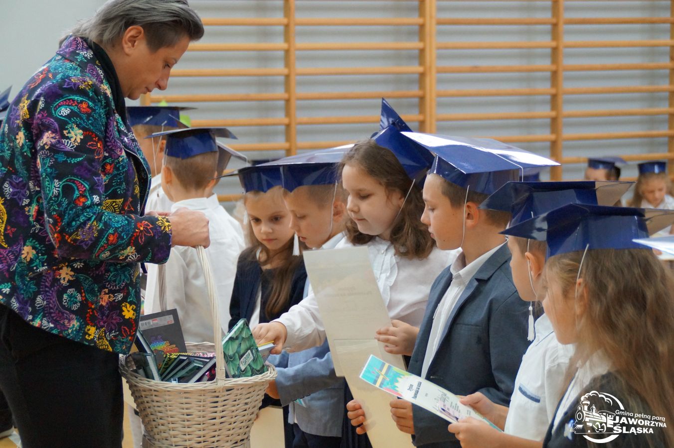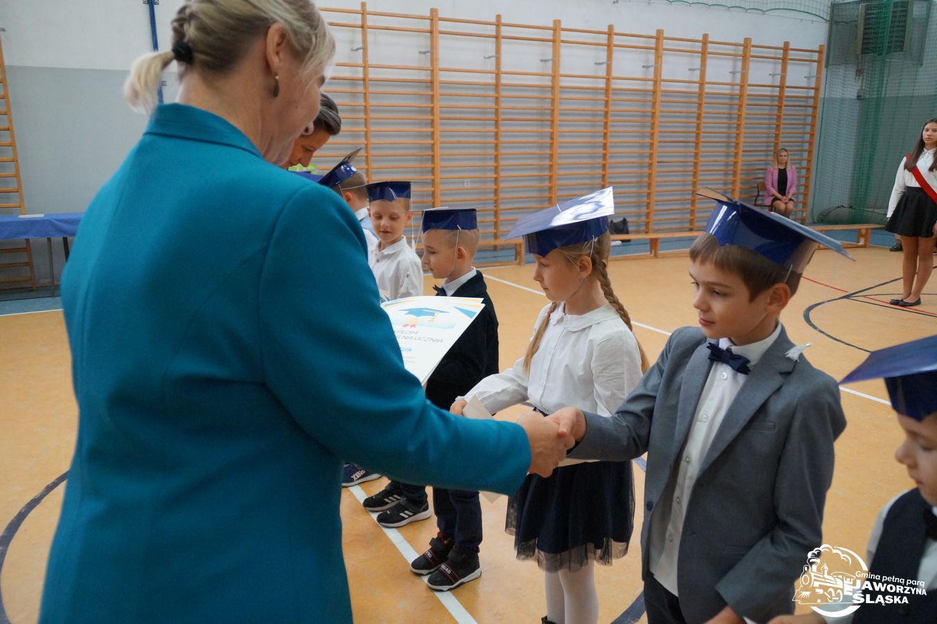 Uroczystego pasowania dokonała dyrektor Małgorzata Adamowicz. Pierwszoklasiści otrzymali także legitymacje szkolne oraz prezenty ufundowane przez rodziców, Urząd Miejski w Jaworzynie Śląskiej oraz uczniów klas drugich i trzecich. – To dla was bardzo ważny dzień, stajecie się pełnoprawnymi uczniami naszej szkoły. Uczcie się dobrze, rozwijajcie swoje pasje, a my dołożymy wszelkich starań, byście czuli się tu jak najlepiej – mówiła Małgorzata Adamowicz.