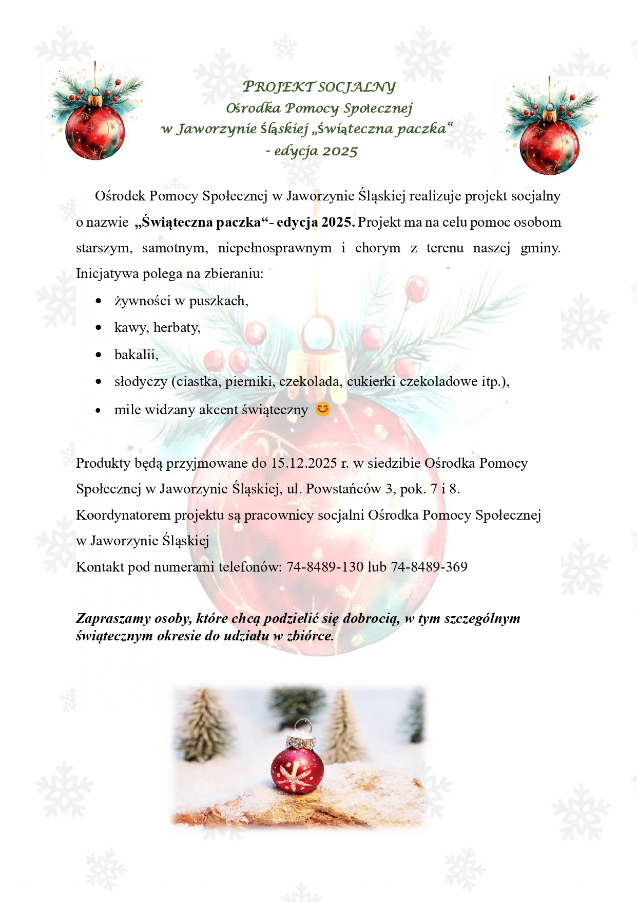 Produkty będą przyjmowane do 15 grudni w siedzibie Ośrodka Pomocy Społecznej w Jaworzynie Śląskiej, ul. Powstańców 3, pok. 7 i 8. Koordynatorami projektu są pracownicy socjalni Ośrodka Pomocy Społecznej w Jaworzynie Śląskiej.