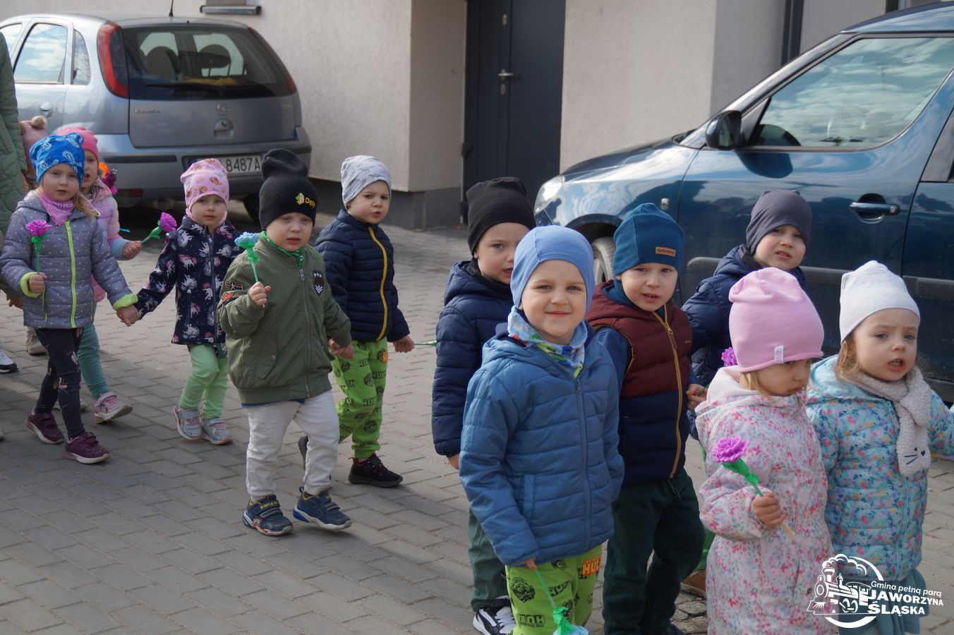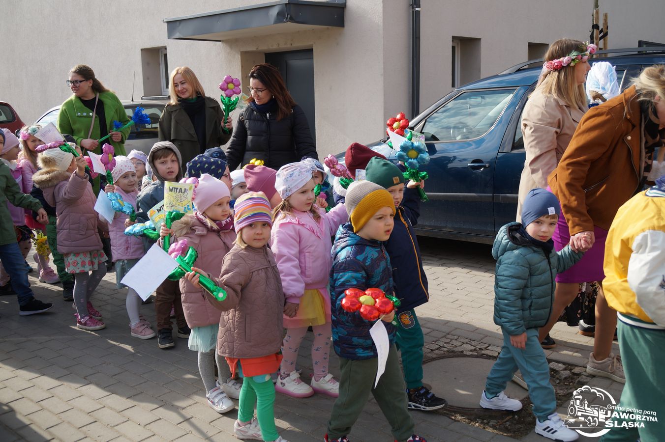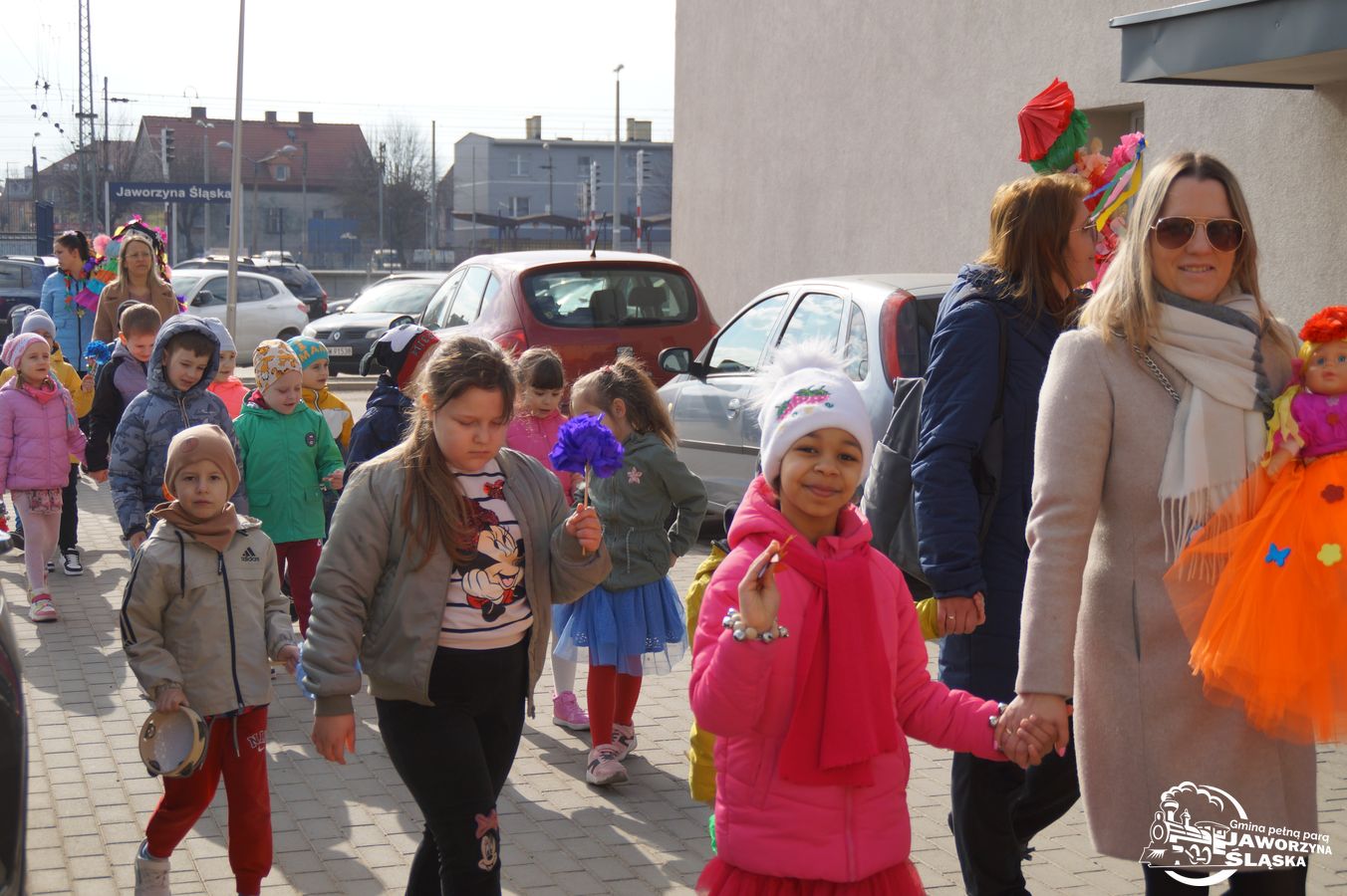 Zaopatrzeni w przygotowane wcześniej kwiaty z bibuły oraz marzanny przedszkolaki z Przedszkola Samorządowego „Chatka Puchatka” wyruszyli na ulice Jaworzyny Śląskiej, aby pożegnać zimę i powitać wiosnę. Radosnym nawoływaniom i piosenkom nie było końca.