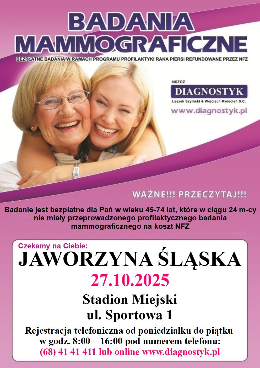 Profilaktyka ma ogromne znaczenie, szczególnie w chorobach nowotworowych. Wczesne wykrycie raka znacznie zwiększa szanse na wyleczenie. Już w poniedziałek, 27 października kobiety w wieku od 45 do 74 lat będą mogły skorzystać z bezpłatnej mammografii. Mammobus znajdzie się w tym dniu przy Stadionie Miejskim w Jaworzynie Śląskiej.