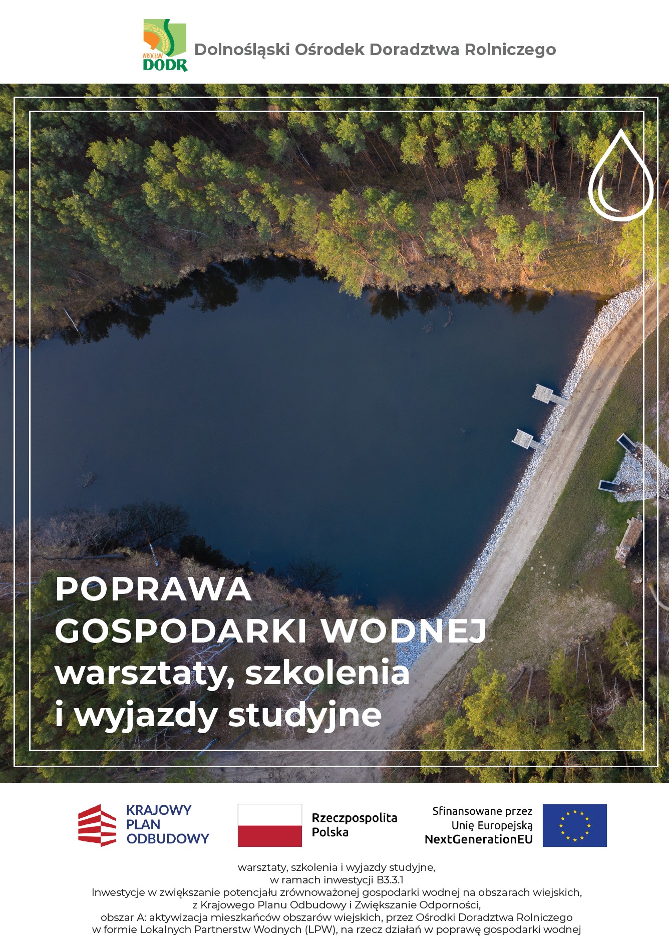 Dolnośląski Ośrodek Doradztwa Rolniczego zaprasza na warsztaty, szkolenia i wyjazdy studyjne, w ramach inwestycji B3.3.1 Inwestycje w zwiększanie potencjału zrównoważonej gospodarki wodnej na obszarach wiejskich, z Krajowego Planu Odbudowy i Zwiększanie Odporności, obszar A: aktywizacja mieszkańców obszarów wiejskich, przez Ośrodki Doradztwa Rolniczego w formie Lokalnych Partnerstw Wodnych (LPW), na rzecz działań w poprawę gospodarki wodnej.