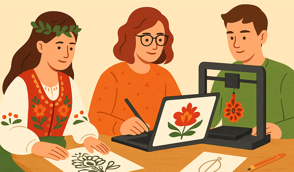 KGW w Zawadach zaprosiło pięcioro uczniów z lokalnej szkoły. Wspólnie z projektantką odbyli szkolenie z podstaw grafiki komputerowej i druku 3D. Podczas warsztatów stworzyli nowoczesną biżuterię inspirowaną haftem kurpiowskim. Efekty zaprezentowali na lokalnym festynie oraz w internecie – łącząc tradycyjny wzór z nowymi technologiami.