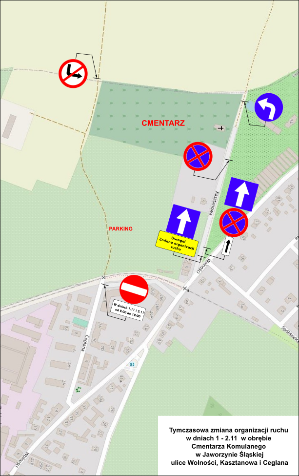 Od skrzyżowania ulicy Wolności z ulicą Kasztanową ruch będzie jednokierunkowy w kierunku cmentarza obiema drogami (asfaltową i gruntową). Wyjazd z cmentarza będzie się odbywał drogą gruntową wokół cmentarza, w kierunku ul. Ceglanej.