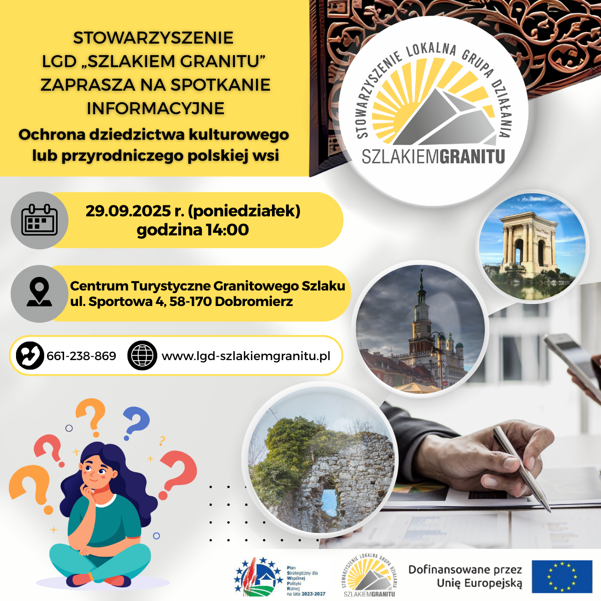 Lokalna Grupa Działania „Szlakiem Granitu” zaprasza na spotkanie informacyjne dotyczące ochrony dziedzictwa kulturowego lub przyrodniczego polskiej wsi . Jest ono skierowane do osób zainteresowanych uzyskaniem dofinansowania na działania w ramach ochrony dziedzictwa kulturowego lub przyrodniczego obszarów wiejskich.