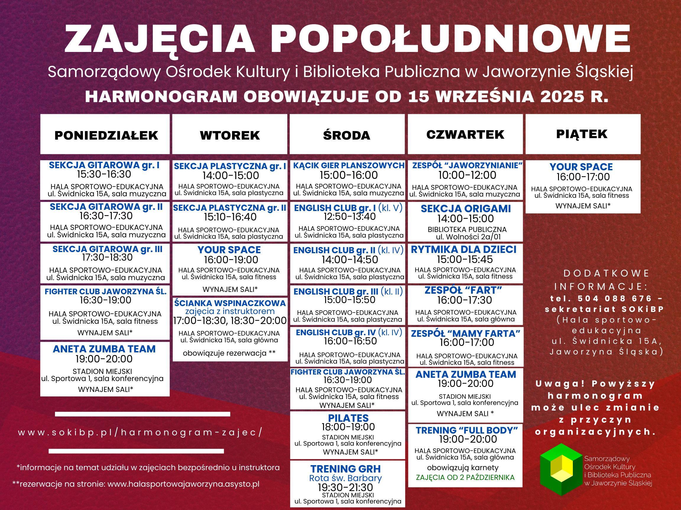 Szczegółowe informacje na temat zajęć oraz odpłatności można uzyskać pod numerem telefonu 504 088 676 (sekretariat SOKiBP) lub na stronie: https://sokibp.pl/harmonogram-zajec/.