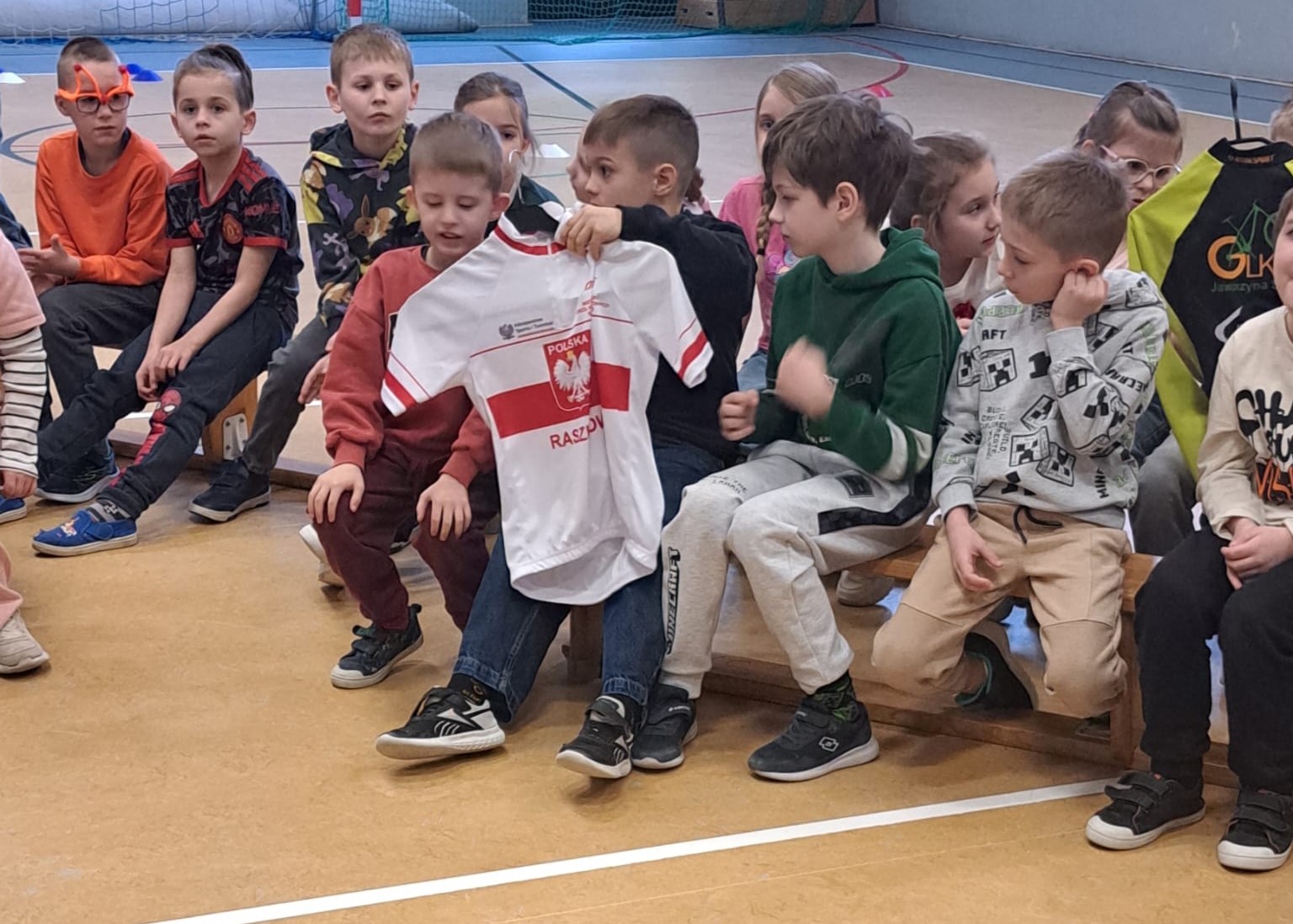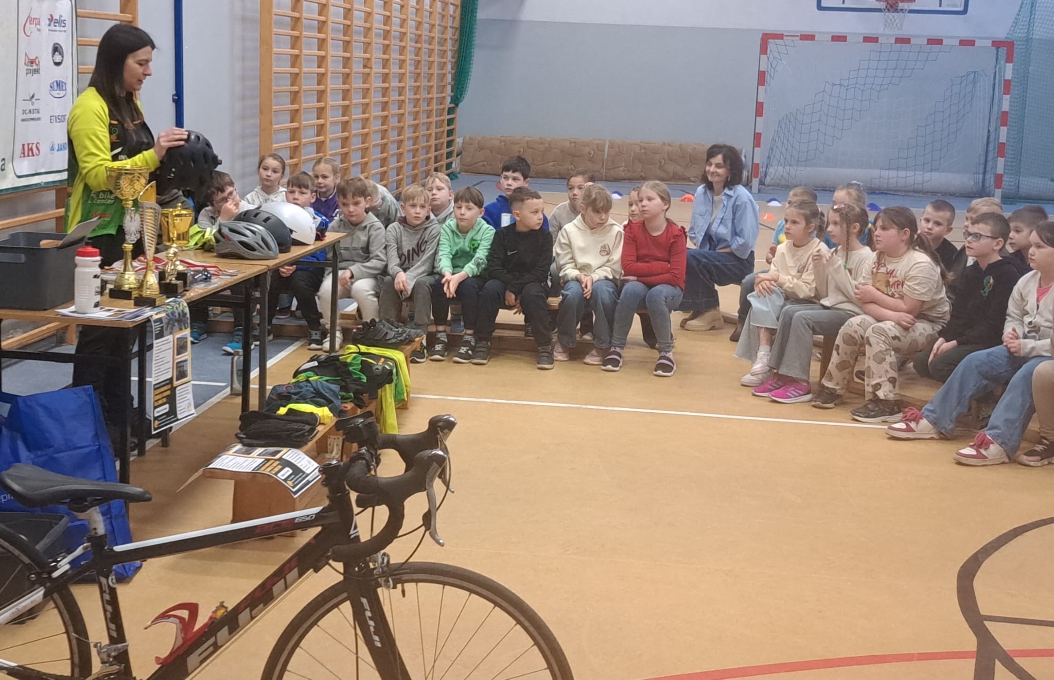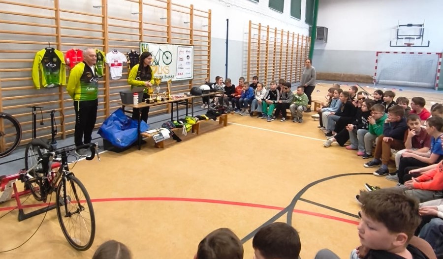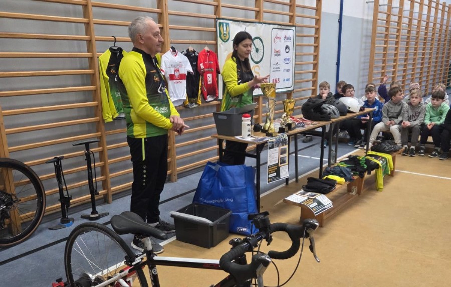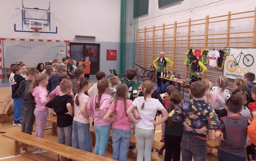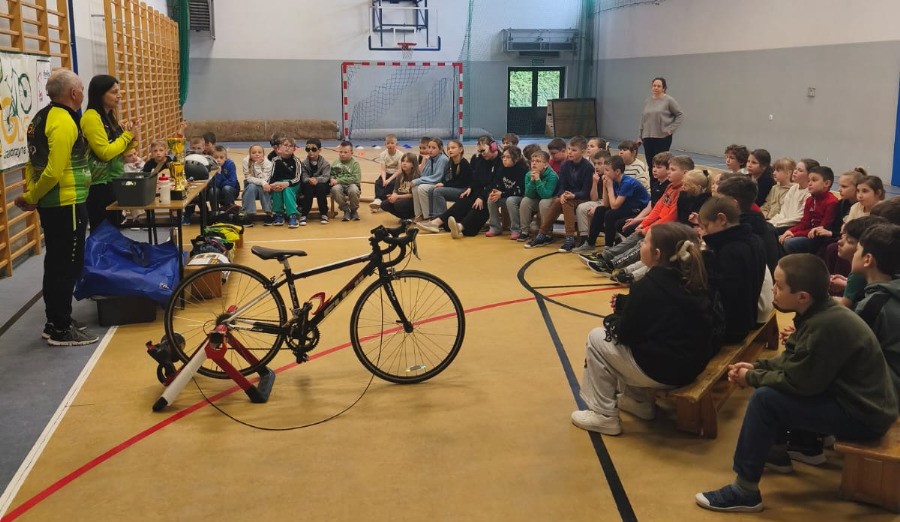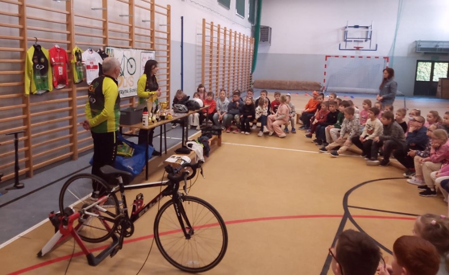 Trenerzy odwiedzili uczniów we wtorek, 31 marca. Spotkanie rozpoczęło się od krótkiej rozgrzewki, a następnie przyszła pora na rozmowy o rowerach i ich rodzajach, kolarstwie, wyposażeniu roweru i rowerzysty, a także o bezpieczeństwie na drodze. Przeprowadzony krótki eksperyment pokazał, że kaski naprawdę działają i skutecznie chronią głowę. Dzieci przekonały się, że kask powinien być obowiązkowym elementem rowerowej wycieczki.