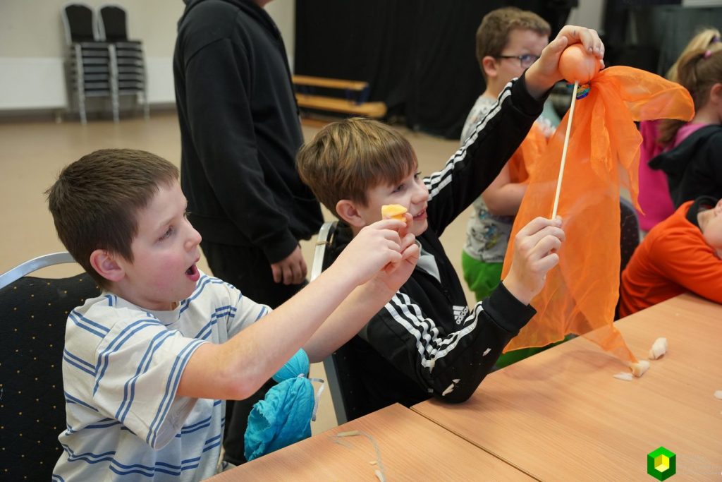 Dzień później odbyły się kolejne warsztaty, tym razem z EduBrick. Sala zamieniła się w prawdziwe śnieżne laboratorium! Dzieci, poznając właściwości hydrożelu, wyczarowały kolorowy, brokatowy śnieg, który – ku ich zaskoczeniu – wcale nie był zimny! Uczestnicy obserwowali, jak zmienia się objętość hydrożelu pod wpływem wody i wykonali własne gniotki. Dzień zakończył się wspólna zabawą i wykonaniem spinnerów z papieru.