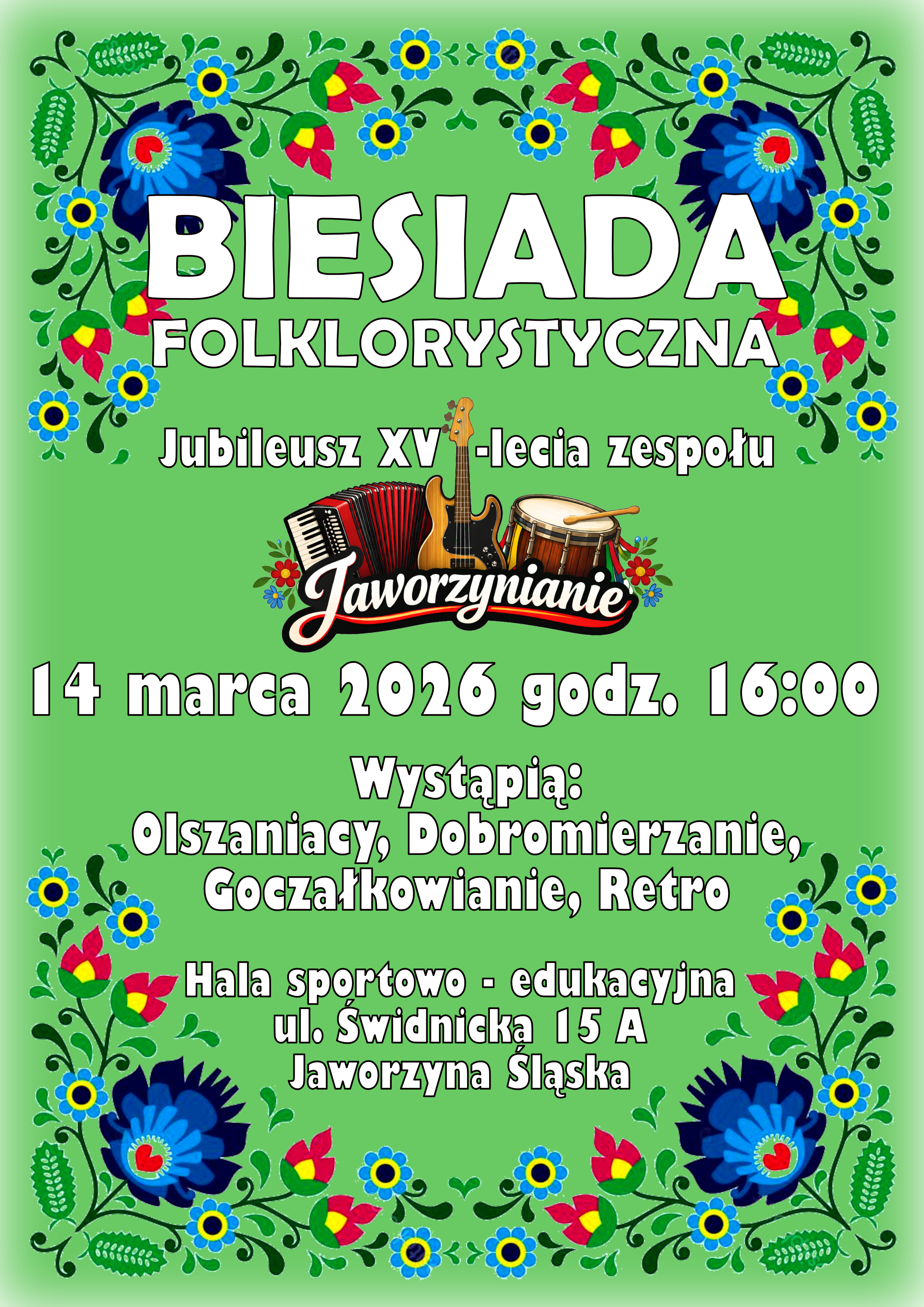 Biesiada odbędzie się w sobotę, 14 marca na hali edukacyjno-sportowej w Jaworzynie Śląskiej. Na scenie wystąpią zaprzyjaźnione zespoły: „Olszaniacy”, „Dobromierzanie”, „Goczałkowianie”, „Retro” ze Strzegomia. Początek o godz. 16.00.