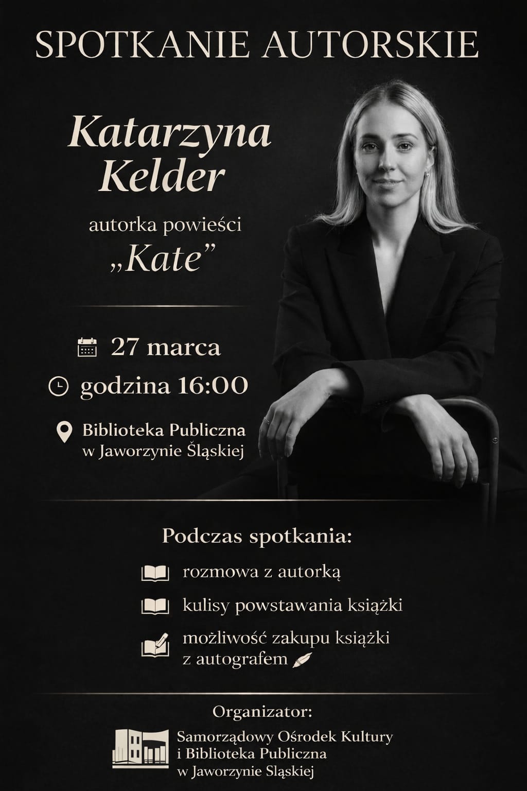 Czy wiesz, jak powstaje historia, która zostaje w pamięci na długo? Samorządowy Ośrodek Kultury i Biblioteka Publiczna w Jaworzynie Śląskiej zaprasza na spotkanie autorskie z Katarzyną Kelder, autorką książki „Kate”, które odbędzie się 27 marca o 16:00 w Bibliotece Publicznej w Jaworzynie Śląskiej.