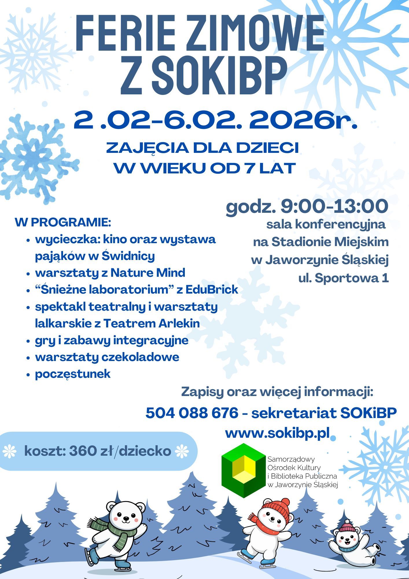Koszt udziału dla dzieci niebędących uczestnikami zajęć przedpołudniowych „Ferie z SOKiBP” wynosi 80 zł/dziecko. Obowiązują zapisy w sekretariacie SOKiBP.