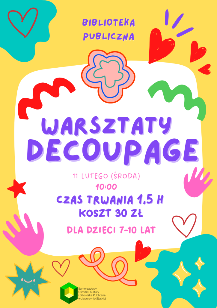 11.02 (środa) – godz. 10:00 – „Serduszka pełne miłości” – walentynkowe warsztaty decoupage dla dzieci. Biblioteka Publiczna zaprasza dzieci od 7. roku życia na wyjątkowe walentynkowe warsztaty plastyczne, organizowane we współpracy z pracownią W-art. Podczas zajęć uczestnicy własnoręcznie wykonają ozdobne serduszka metodą decoupage, które mogą stać się pięknym walentynkowym prezentem dla bliskiej osoby.