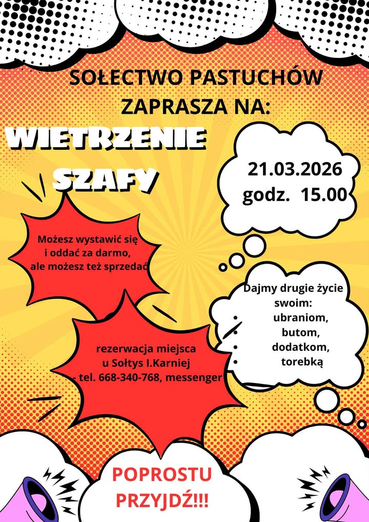Masz ubrania, które już na Ciebie nie pasują? A może chcesz wyszukać cos odpowiedniego dla Ciebie w odzieży używanej? Sołectwo Pastuchów zaprasza do wspólnej akcji wietrzenia szaf. To doskonała okazja, żeby oddać bądź sprzedać odzież niepotrzebną. Akcja jest otwarta dla wszystkich chętnych.
